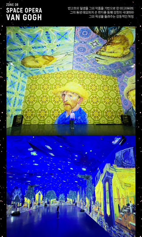전시 2관은 8m 높이의 거대한 몰입형 미디어와 서라운드 음향 시설을 갖춘 오페라극장으로, 빈센트 반 고흐의 작품세계 속에 있는 듯 낭만적인 시청각 전시를 경험하실 수 있습니다.