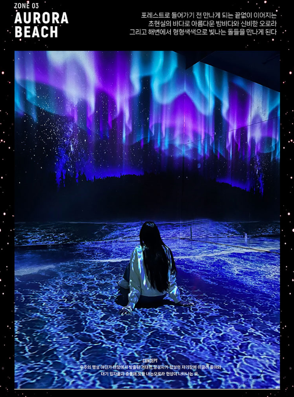 전시 1관은 총 7개의 전시 공간으로 구성된 디지털 미디어아트 전용 전시관으로, 환상적인 바다와 숲을 마주하는 신비롭고 특별한 체험을 선사합니다.